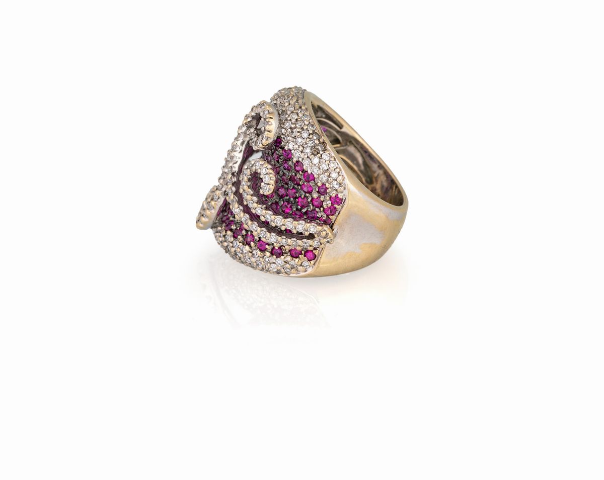 in oro bianco 750/000 con pavè di rubini ct 3,00 ca e riccioli di brillanti ct 1,50 ca, g 19. Misura 10