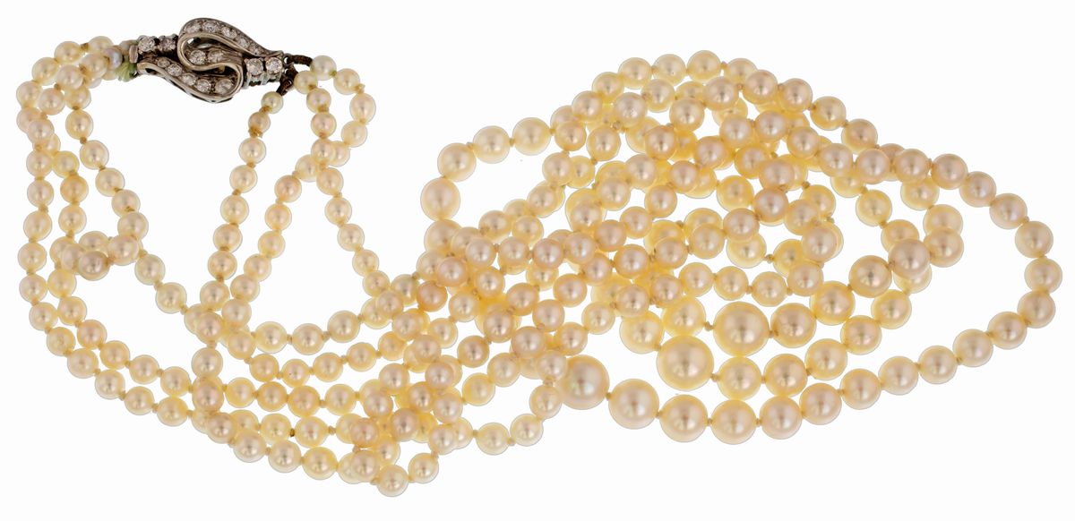 in gradazione da mm 3,5 a 7,00, con chiusura in oro bianco 750/000 e brillanti.