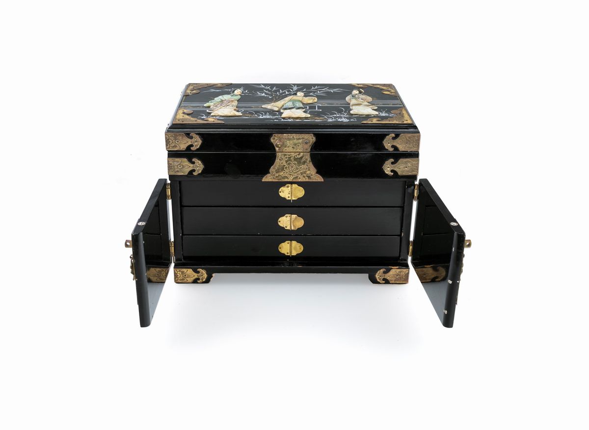 con cerniere e finiture in metallo dorato finemente cesellato; coperchio ornato da figure in lacca e madreperla con specchio al verso e ampio vano; due antine frontali celano tre tiretti in colonna privi di traverse suddivisi in scomparti.
