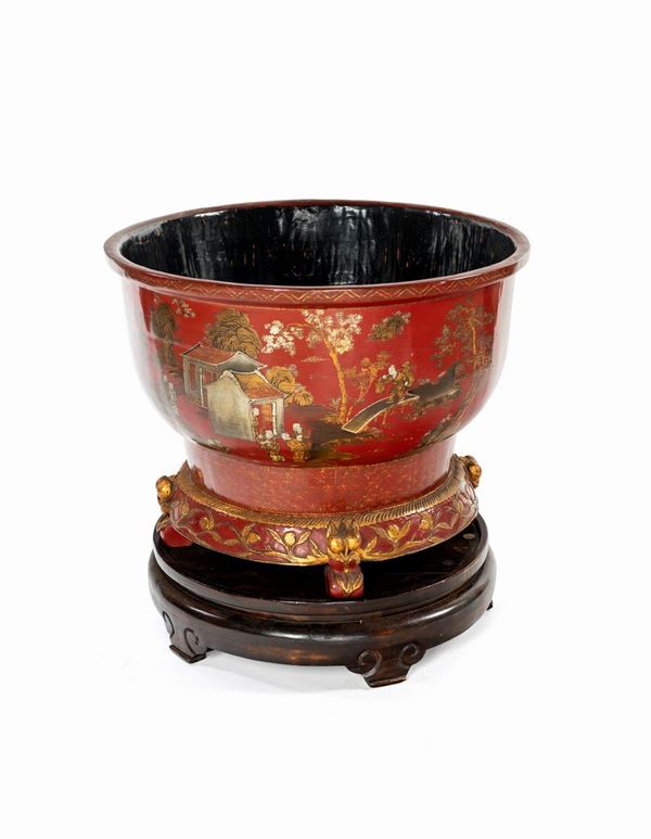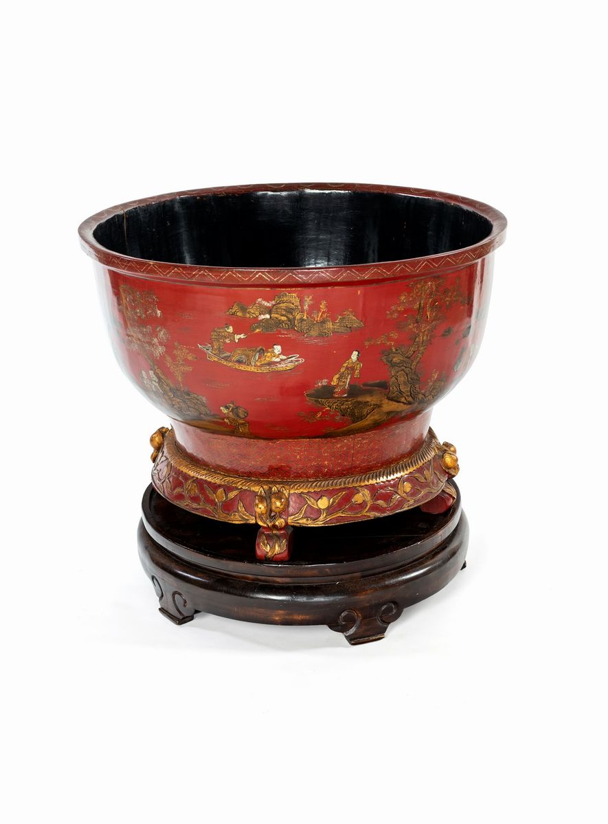 decorati a tutto tondo da cineserie dorate su fondo rosso lacca; di forma circolare recano piedi arricchiti da rilievi in forma di frutta e poggiano su basi circolari in legno. Piemonte XVIII secolo.