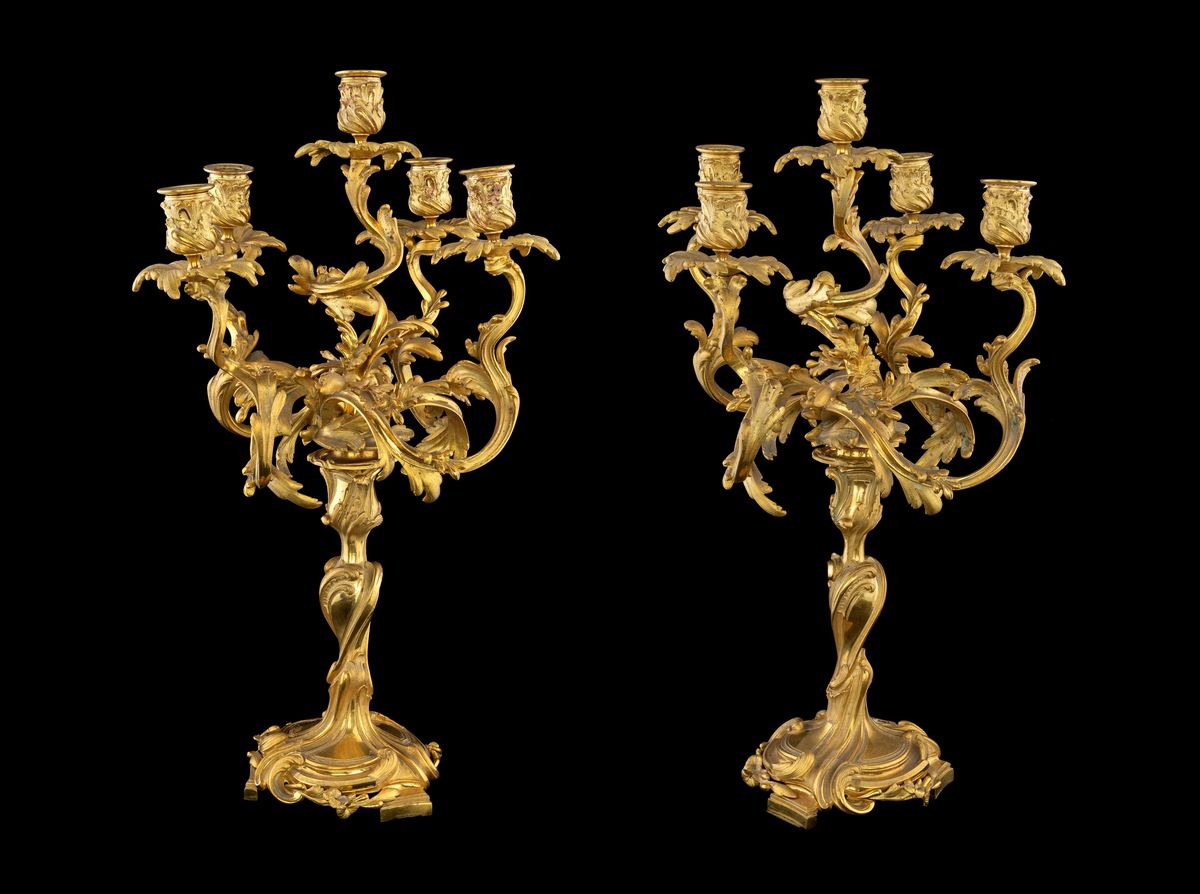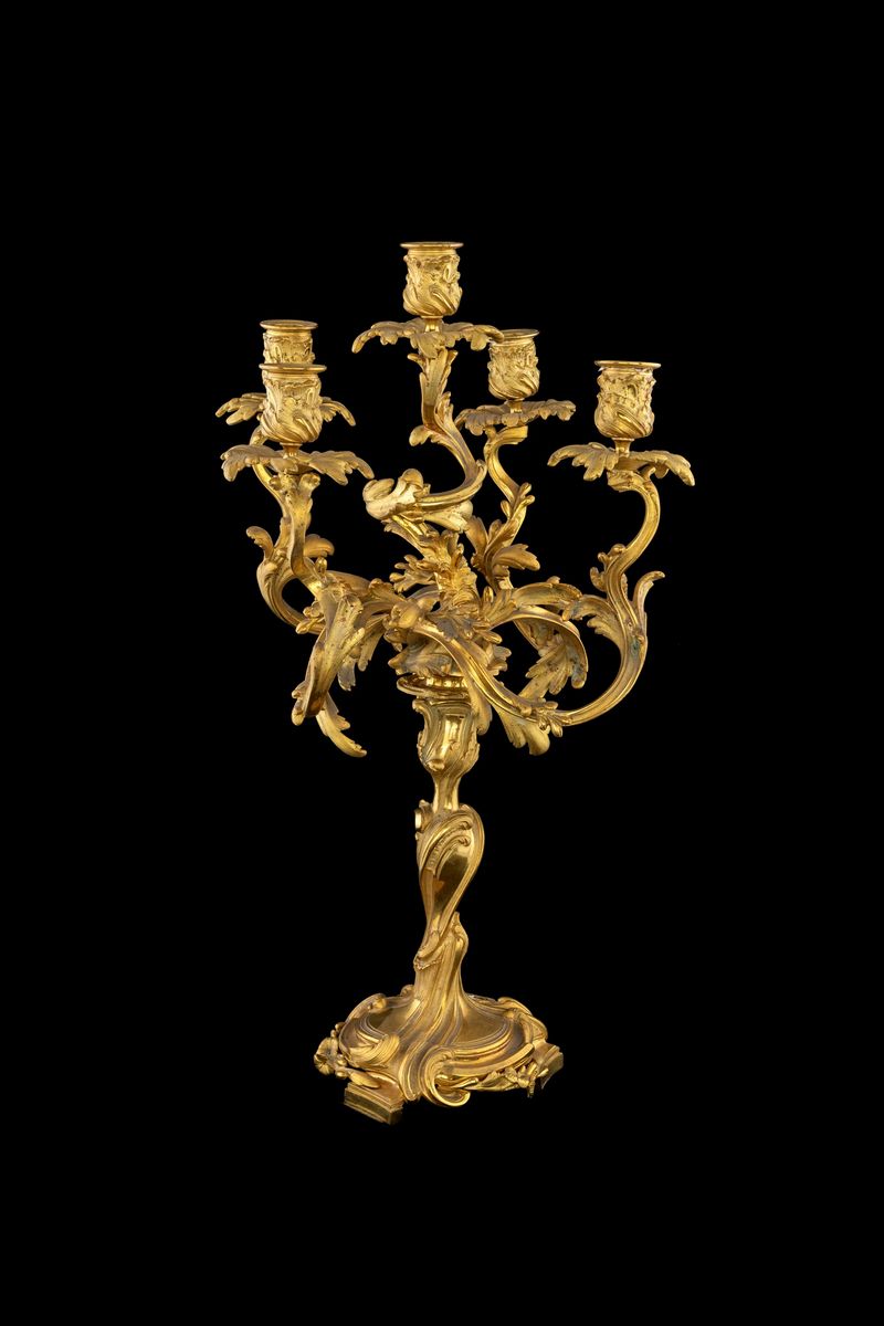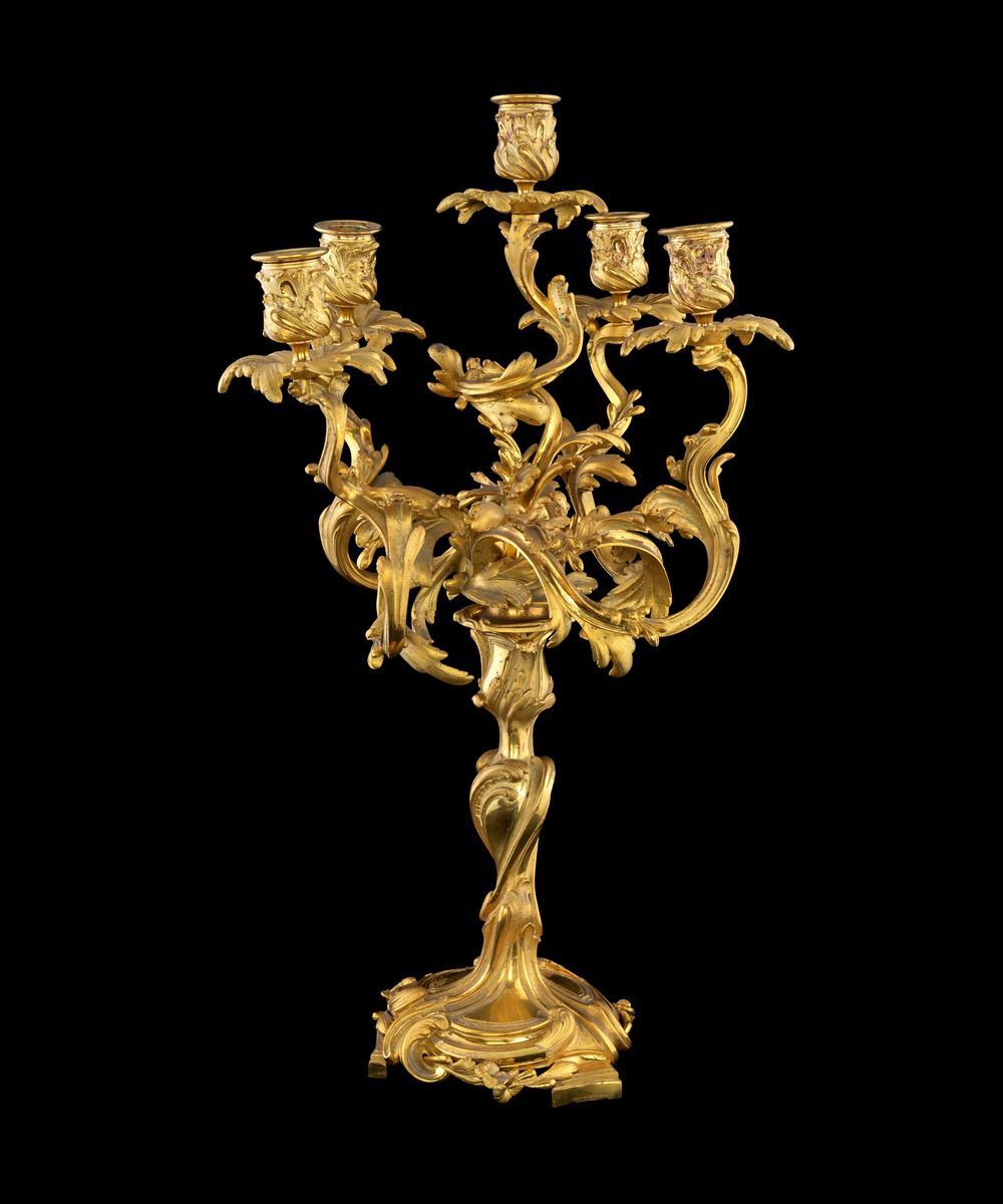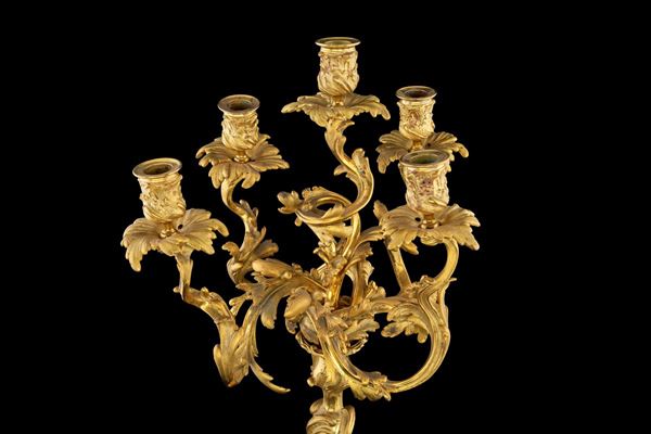 a cinque luci, con bracci sagomati in forma di volute vegetali. XIX secolo.