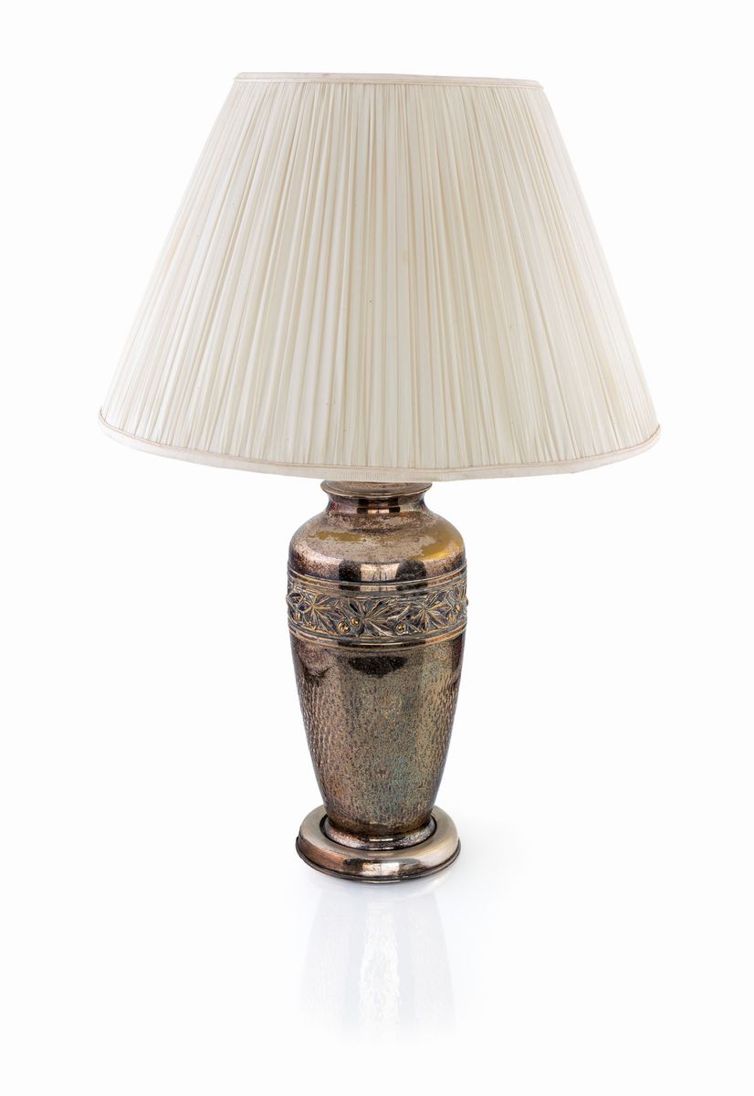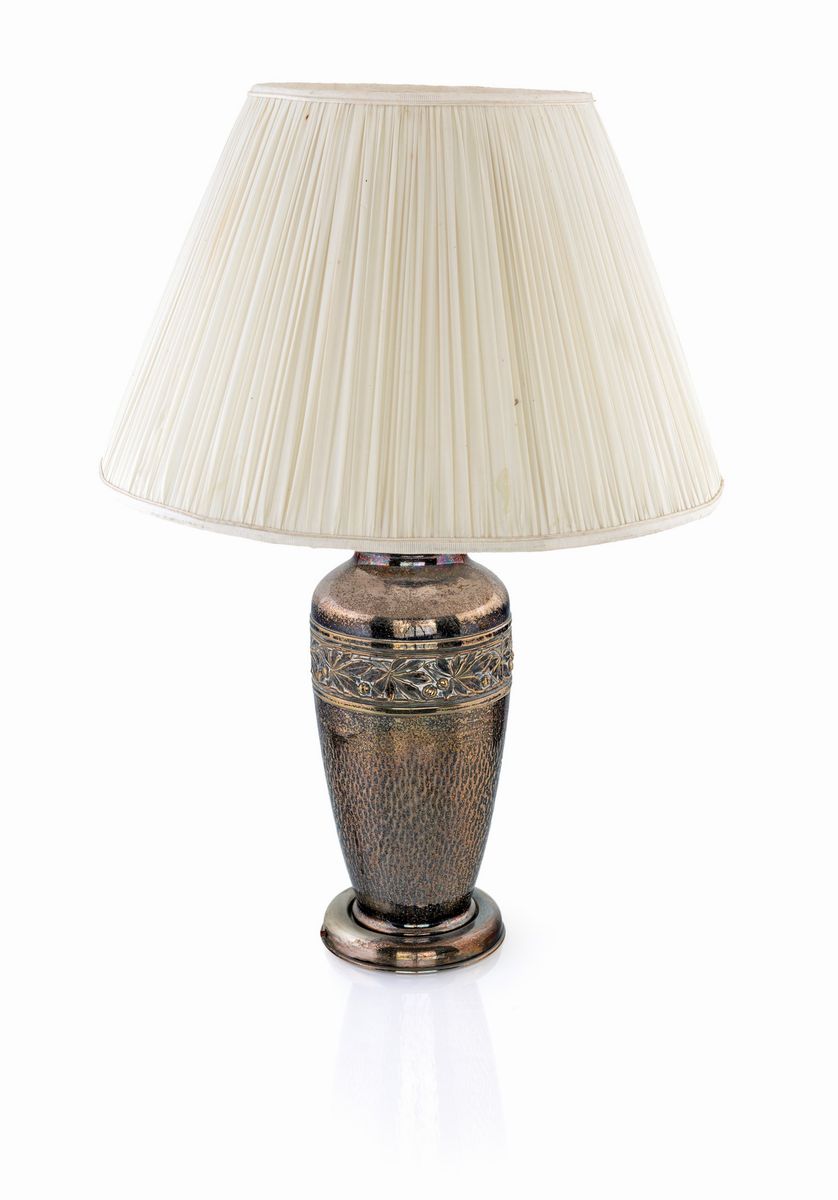 a forma di vaso con corpo liscio ornato nella parte superiore da una fascia a motivi naturalistici. Complete di paralume.
