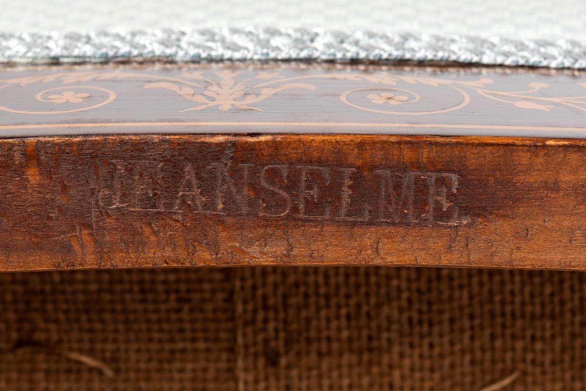 in mogano con filettature ed intarsi a motivi floreali in acero; di linea squadrata recano schienali e sedili imbottiti rivestiti in tessuto originale di Aubusson; braccioli curvilinei, gambe lievemente sagomate. Recano stampiglia dell'ebanista Jeanselme sotto la seduta. Epoca Carlo X.