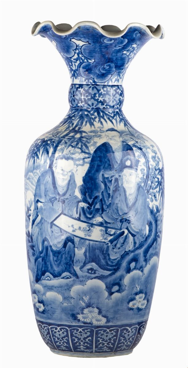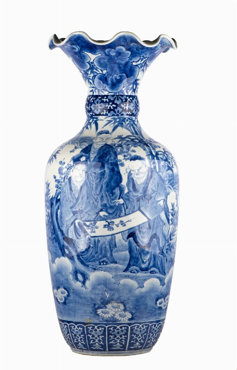 ad anfora in porcellana con profilo ondulato, decorati a tutto tondo da un paesaggio orientale animato da figure di dignitario in monocromia blu su fondo bianco. Cina, XIX secolo.