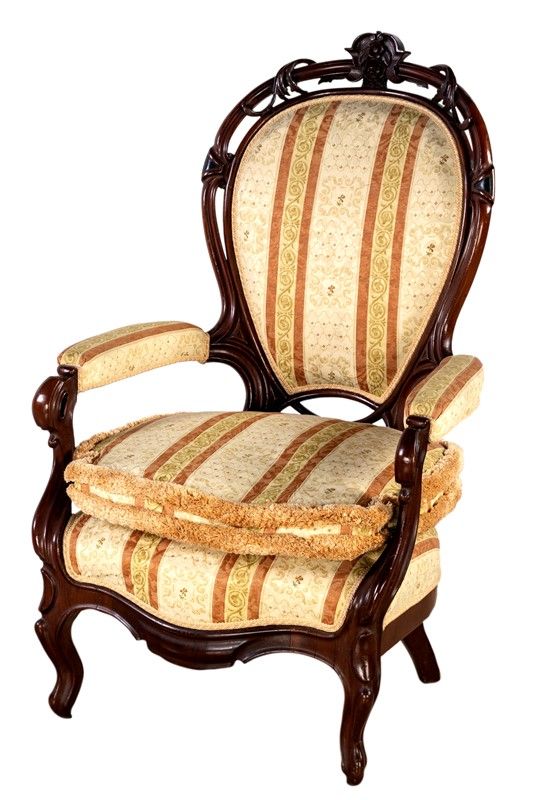 in mogano, con telaio curvilineo decorato da cartigli intagliati posti sulla sommità degli archi da cui si dipartono volute vegetali che si avvolgono lungo le cornici; schienali e sedili imbottiti guarniti di cuscini, piedi sagomati. XIX secolo.