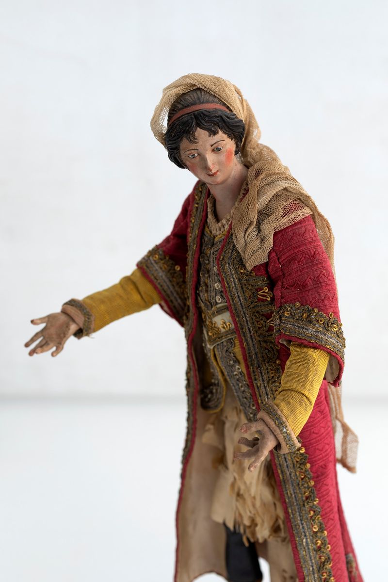 attribuita a G.B. Polidoro (sec XVIII), ricco panciotto beige, giacchetta ocra con gallonature, cappotto rosso, stivali ai piedi. Difetti alla vestitura.