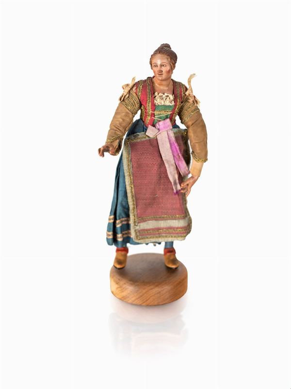 attribuita a Nicola Somma (sec. XVIII). Camicia bianca merlettata, corpetto in velluto verde, giacchetta rossa con gallonature, maniche beige unite alla giacchetta da nastri, gonna turchese, ampio sinale rosa con grande fiocco, scarpette con fibbia.