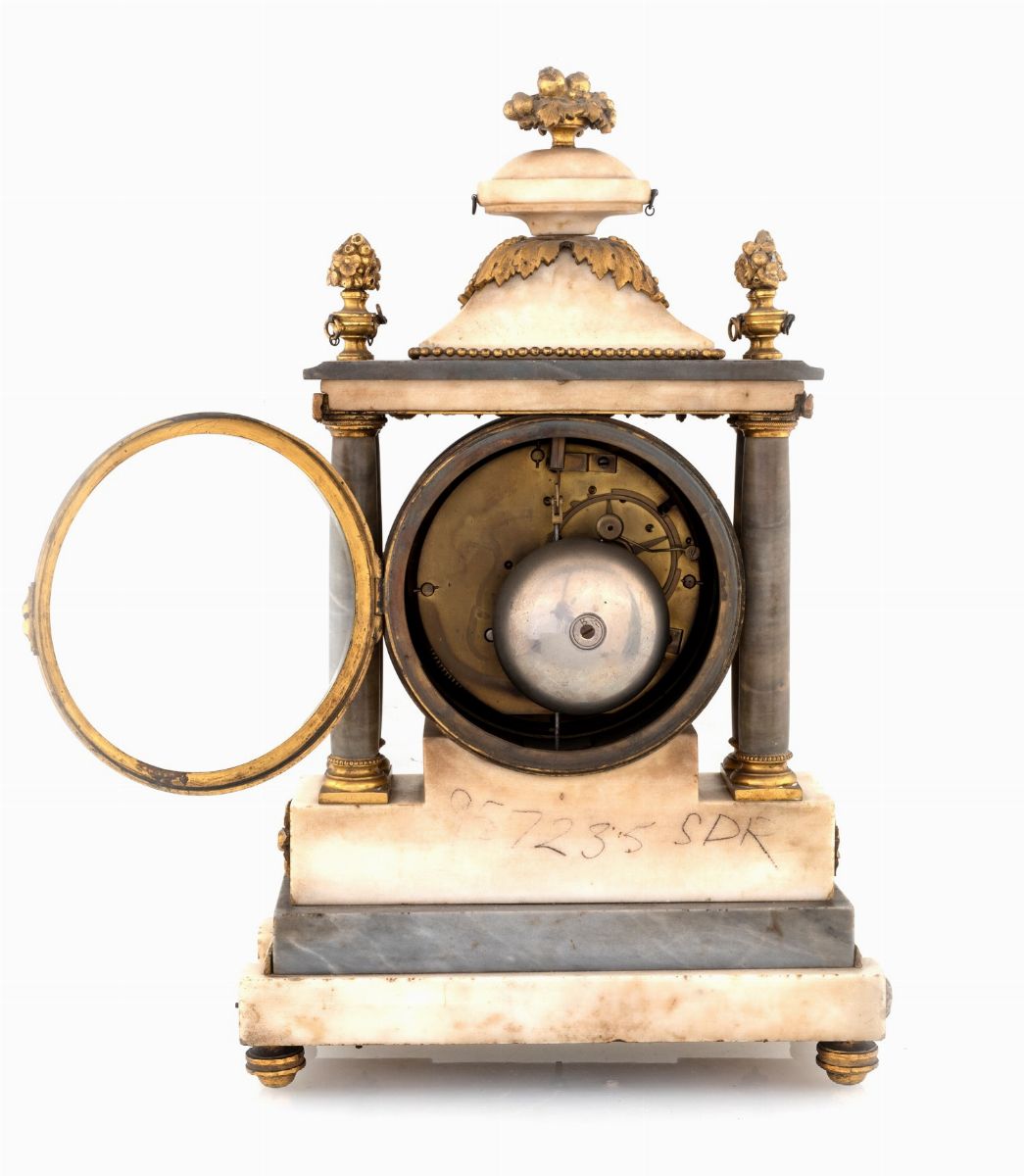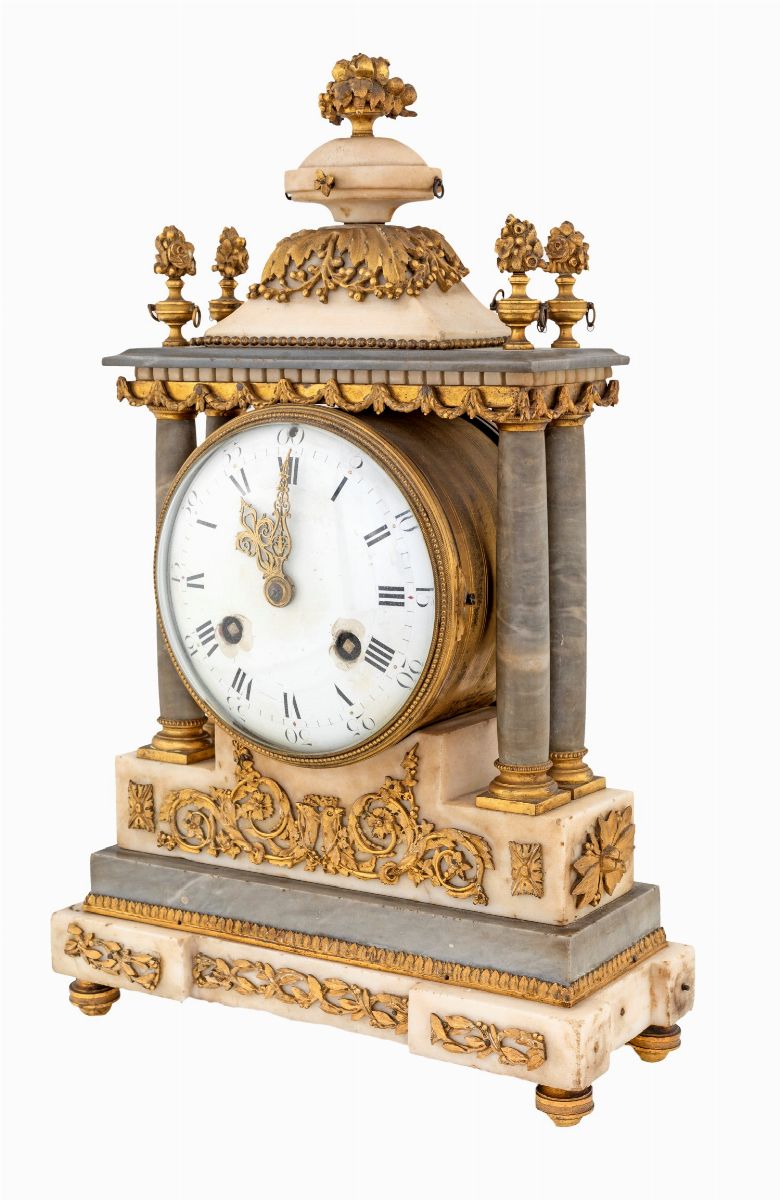 in marmi bianco e grigio con finiture in bronzo dorato; quadrante in smalto bianco a due fori di carica con fascia oraria a numeri romani. Francia, fine del XIX secolo.