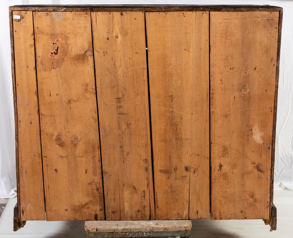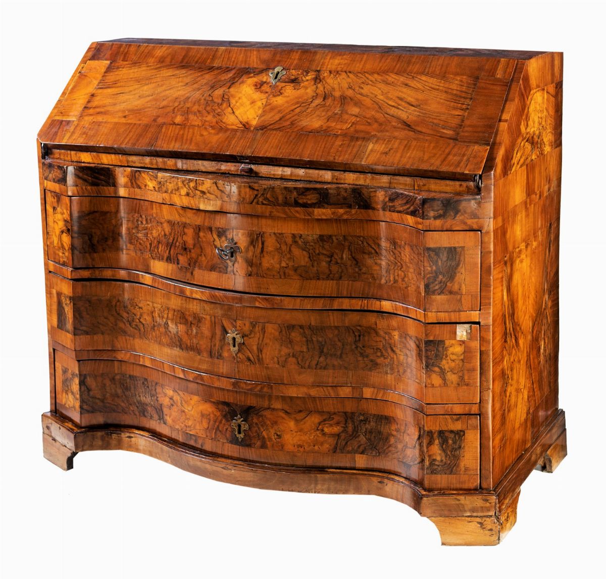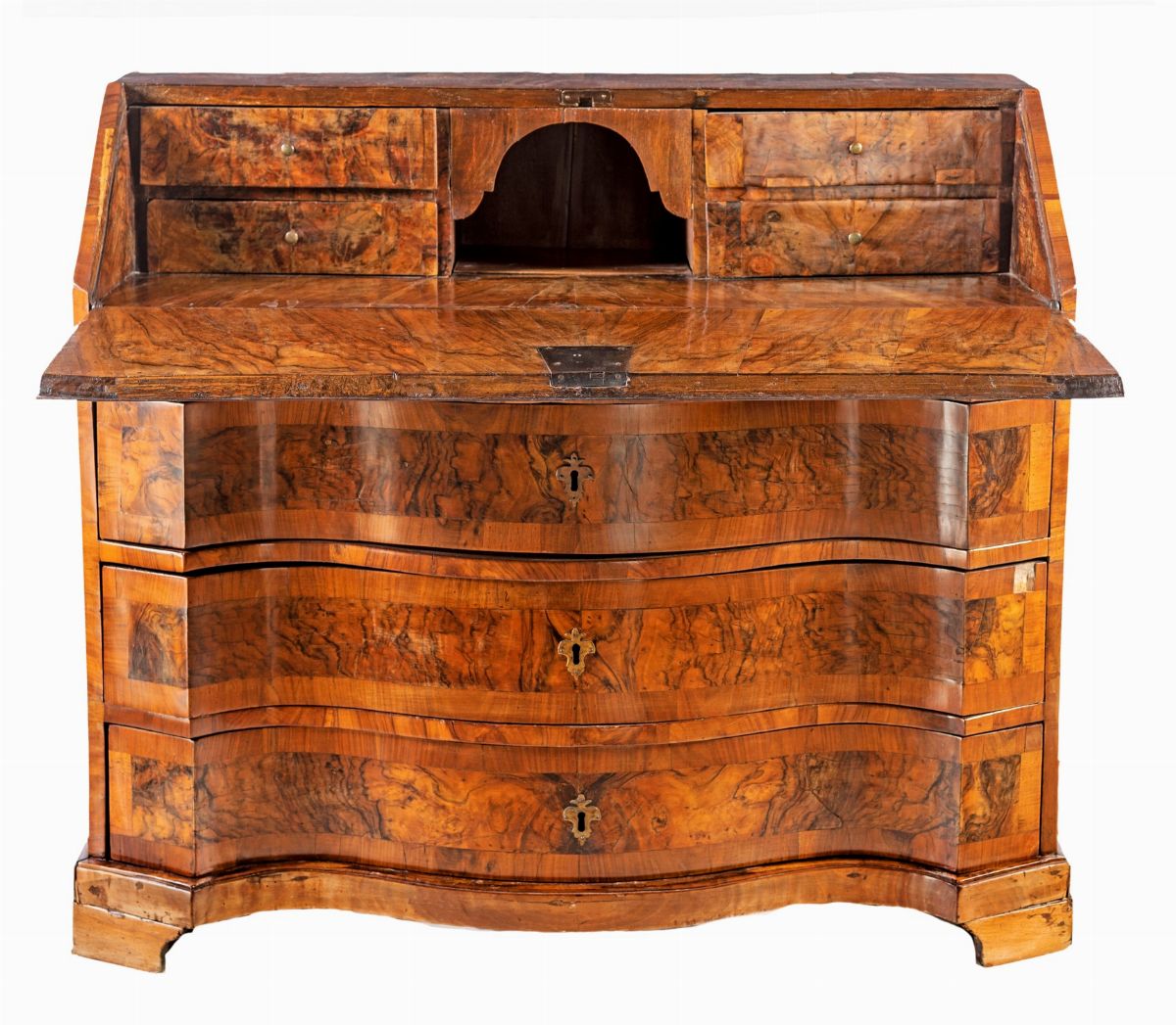 con specchi in radica racchiusi da filettature lineari; la ribalta ospita un vano centrale con piano sollevabile a celare uno scomparto, affiancato da due tiretti per parte; facciata sagomata con tre cassetti, piedi a mensola. XVIII secolo.