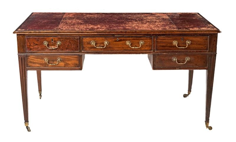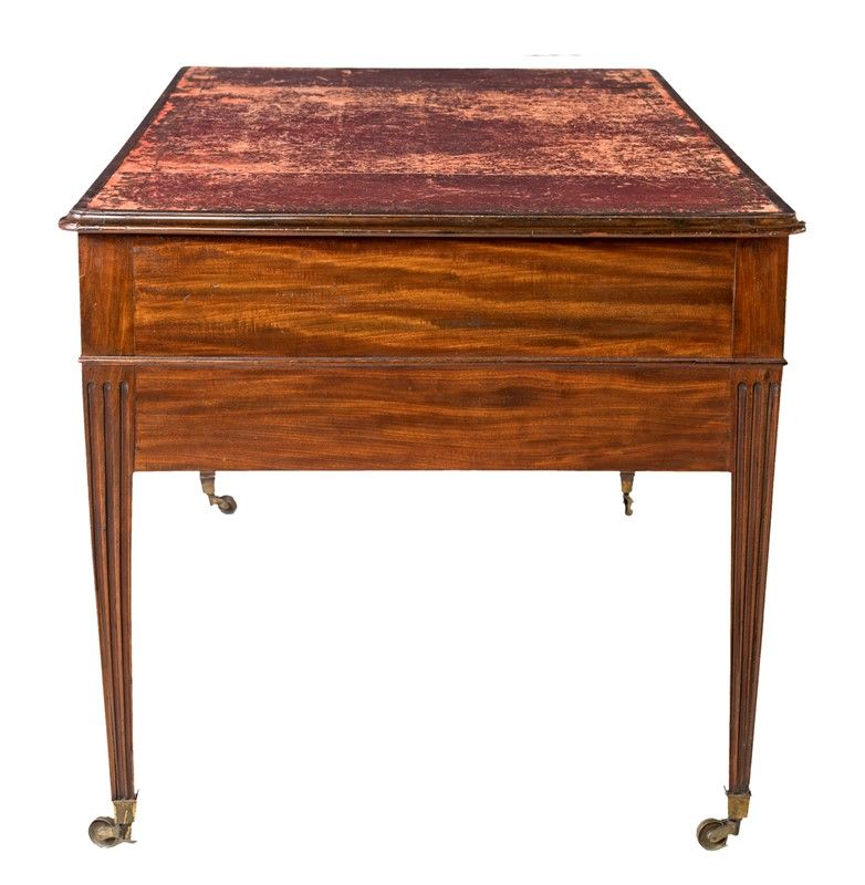 da centro in mogano, con due cassetti in linea nella fascia e due sottostanti disposti ai lati, cui corrispondono sull'altra facciata un cassetto centrale delimitato da due in colonna; piano rivestito in pelle, gambe rastremate scanalate poggianti su ruote. Inghilterra, XIX secolo.