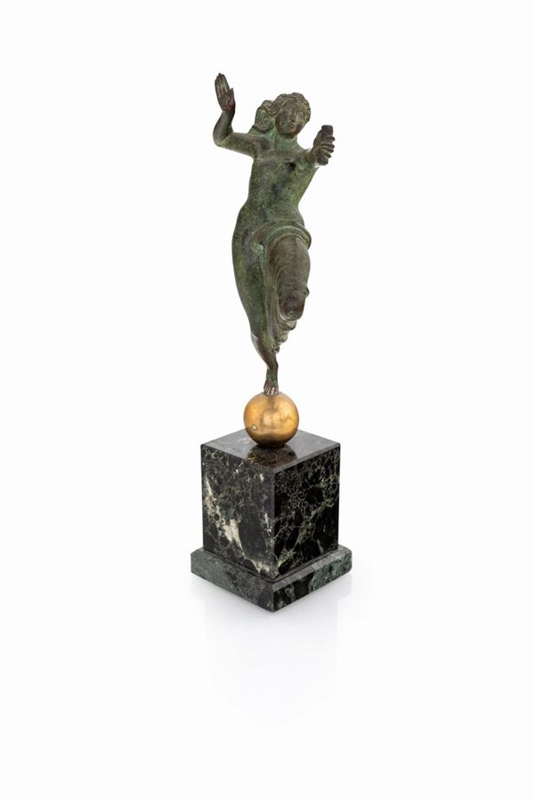 raffigurante menade danzante su di una sfera dorata; piedistallo in marmo verde. Francia, secondo quarto del XX secolo.