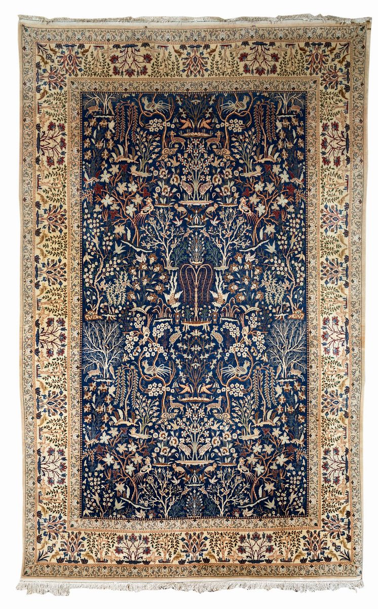 con fitta disegno naturalistico con piante e uccelli entro un'ampia bordura chiara.