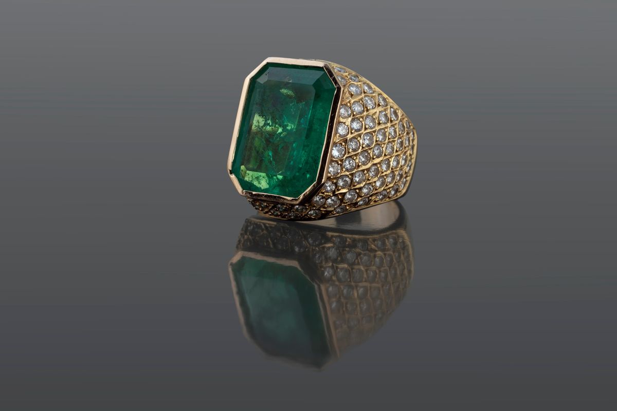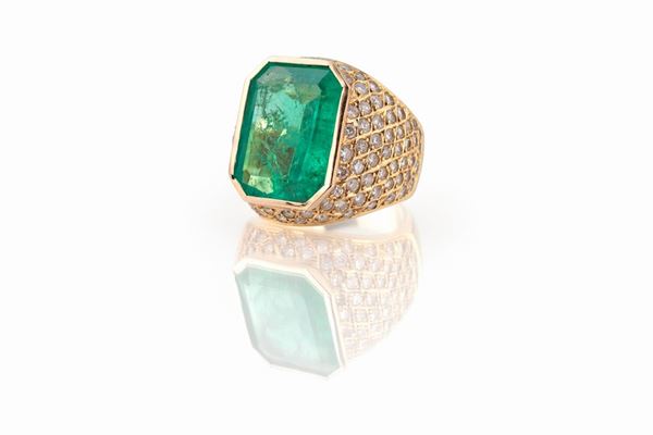 ct 10,20 circa di forma ottagonale su montatura in oro giallo 750/000 impreziosita con 115 brillanti ct 2,15 circa, g 15,15. Verifica gemmologica di Alberto Scarani, IGI Antwerp Graduate Gemologist.