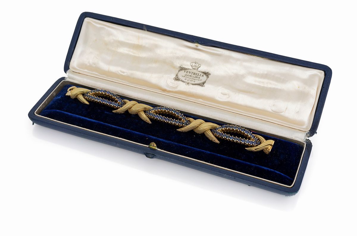In oro giallo, 750/000, con zaffiri cabochon, tot. gr 65, astuccio originale.