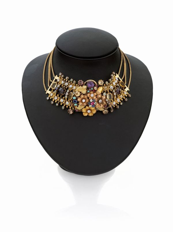 composizione floreale finemente lavorata con incisione su foglie, petali in oro giallo, rosso e verde. Rubini, zaffiri, diamanti, ametista e quarzi impreziosiscono il centro ricamato da perline. Catena a 4 fili in oro giallo 18Kt