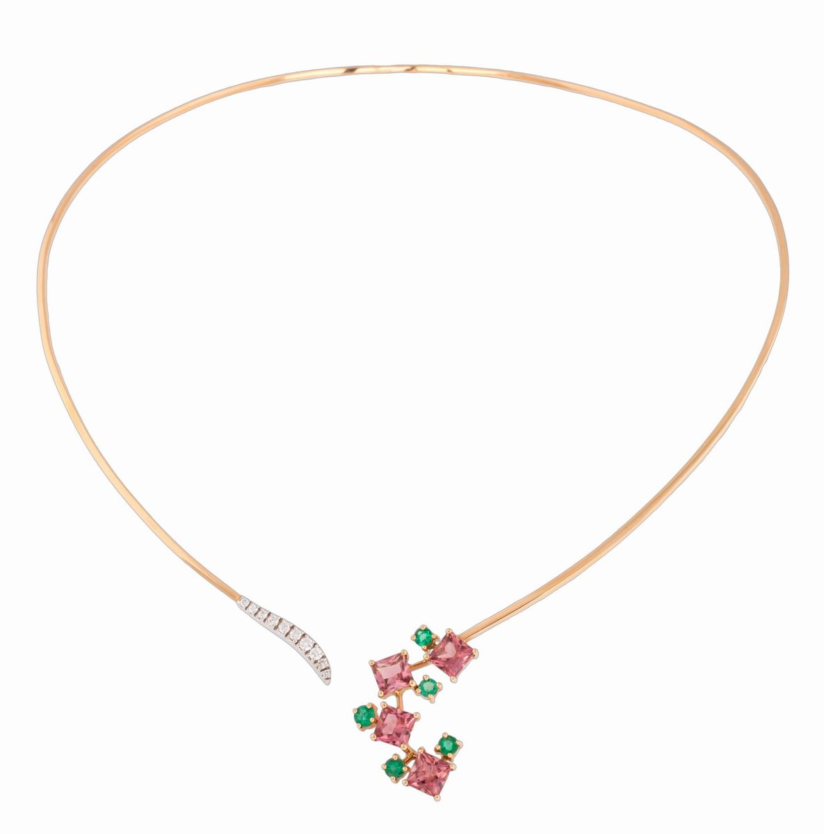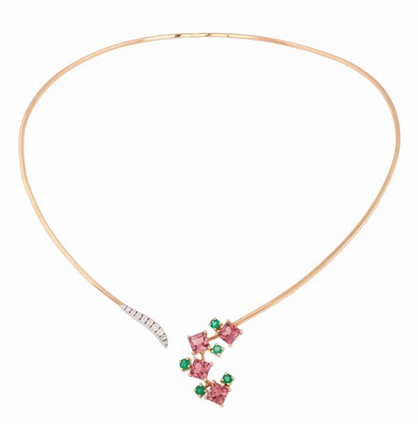 qualità extra, taglio princess ct 4,20, cinque smeraldi ct 0,74 e brillanti ct 0,27. Filo quadrato in oro rosa 750/000, g 22