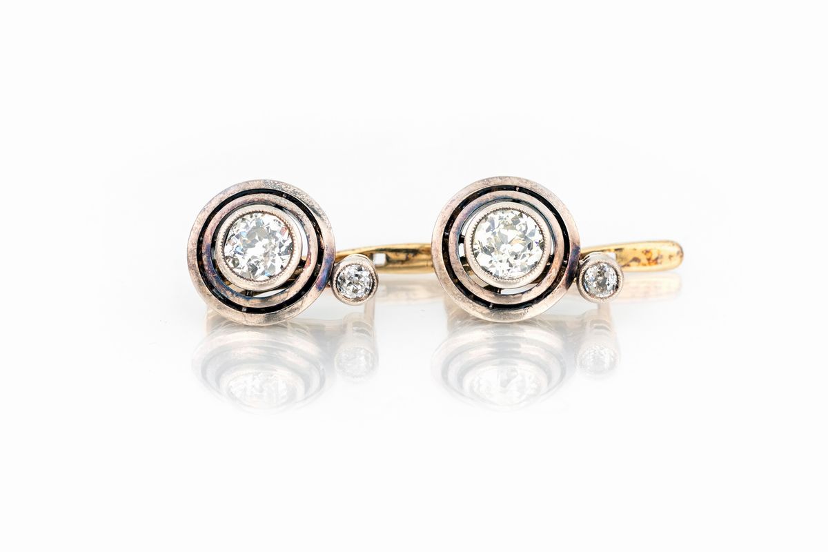 taglio antico di ct 1,80/1,90 totali circa, colore G-Vs/Si, in oro giallo 750/000 e chiusura a monachella, g 6,30.