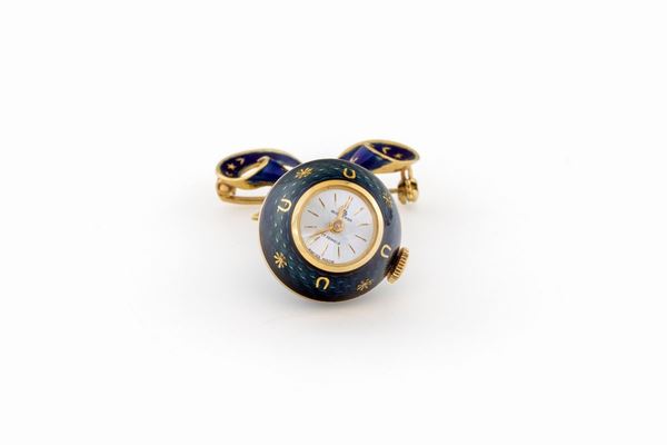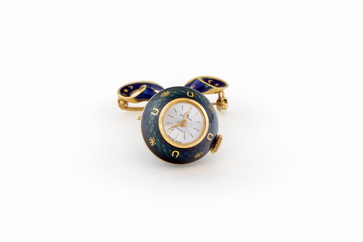 a fiocco in oro 750/000 con smalto a fuoco, funzionante. Ottimo stato di conservazione.