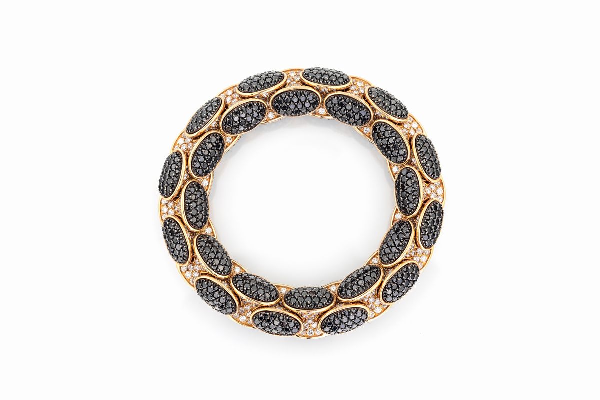 in oro 750/000 con diamanti neri ct 25,74 e brillanti bianchi ct 14,15, particolare manifattura con molla estensibile resistente, g 110