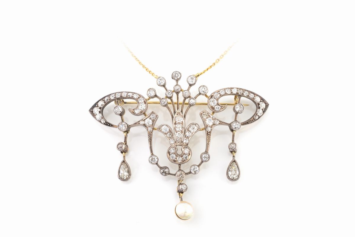 in oro giallo, argento con due gocce di diamanti e brillanti taglio antico ct 6,00 circa e una perla barocca naturale 7,00 mm, g 23