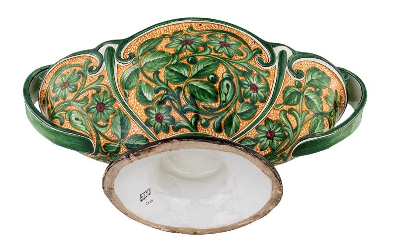con corpo ovale biansato suddiviso in partizioni delimitate da nervature in rilievo a racchiudere la fitta decorazione a motivi floreali nei toni dominanti del verde su fondo ruggine. Reca il marchio delle Ceramiche Artistiche Fiorentine.