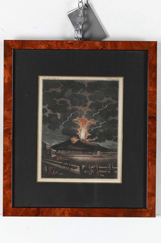 acquerellata a mano, raffigurante un vulcano in eruzione, cm 22,5x18. Entro cornice moderna in radica, cm 37,5x33