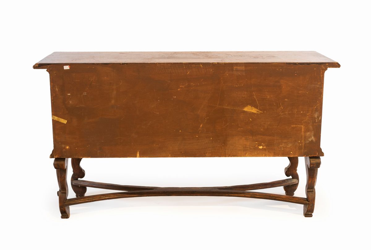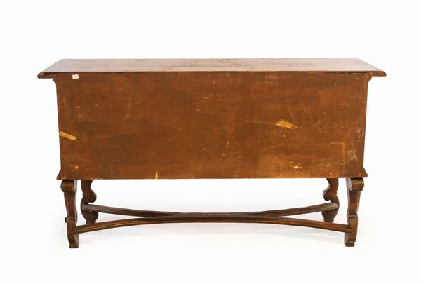 con piano rettangolare e facciata apribile a ribalta scandita da sei formelle a simulare due ordini di cassetti; cornice inferiore modanata. piedi scolpiti in forma di voluta riuniti da traverse a crociera.
