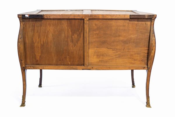con specchi in radica racchiusi da filettature in legno di rosa; di forma sagomata su gambe a sciabola calzate di scarpette in bronzo, recano due cassetti in colonna frontali e piano in marmo giallo.