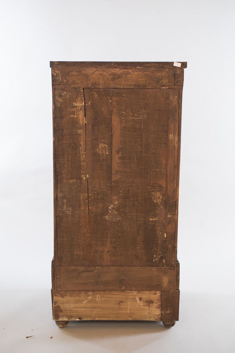 con piano incernierato a celare un ampio vano, facciata delimitata da colonne con manicotti in bronzo, scandita da un'antina a ribalta compresa nella fascia, uno sportello sottostante ed un tiretto.