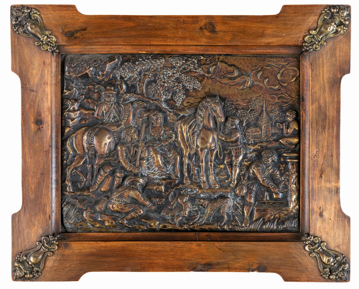 raffiguranti paesaggi con cacciatori e dame, entro cornici in noce con angoli cuspidati abbelliti da rilievi in tolla. Inizio del XX secolo.