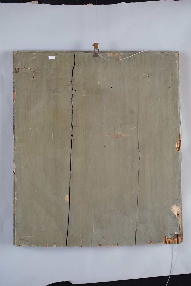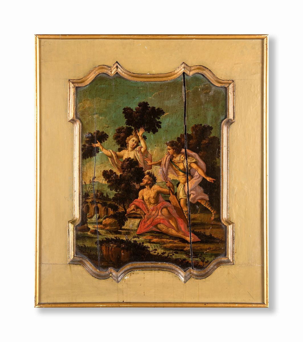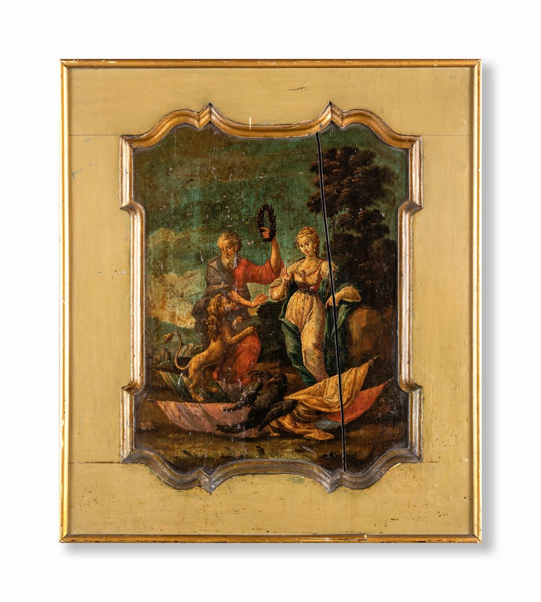 con specchiature sagomate dipinte in vivace policromia a raffigurare rispettivamente Apollo e Dafne e l'allegoria dell'unione matrimoniale.