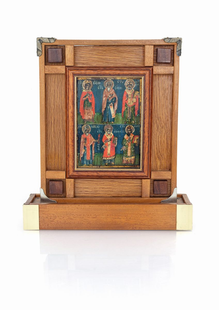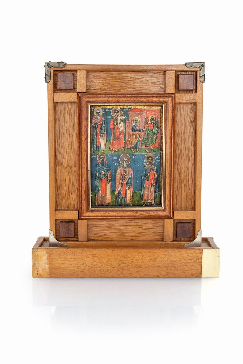 raffigurante i Santi Fiodosi, Stefani e Dimitri sotto i quali sono dipinti Antonio, Ifimi e Fiodoro; al verso Santa Barbara e i Santi Sava e Nicolai; sotto Spiridon, Oifanasi e Kirillo. Telaio e base di supporto in legno naturale.