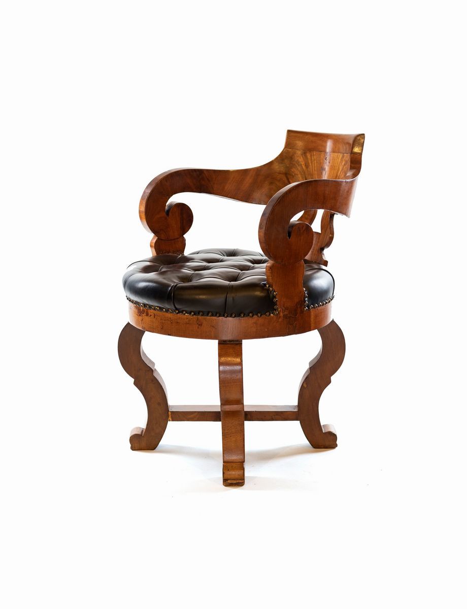 con schienale avvolgente e sedile imbottito rivestito in cuoio capitonné.