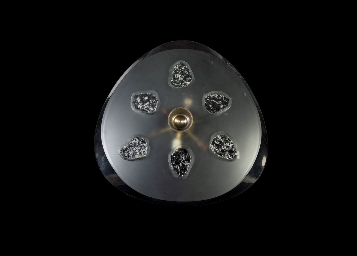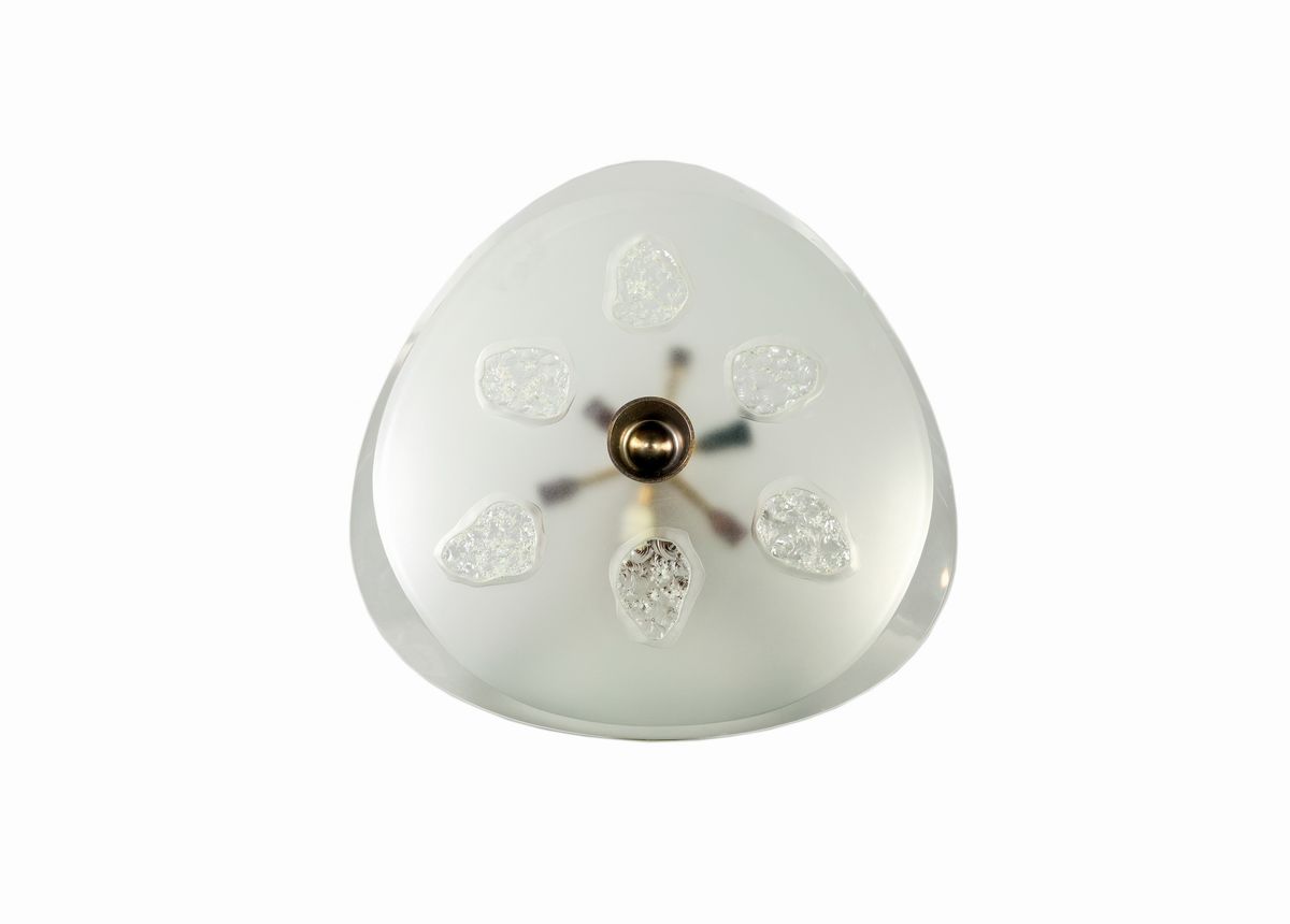 mod 1748 cristallo ultra spesso sagomato e inciso a sabbia su fondo smerigliato . Montatura in ottone