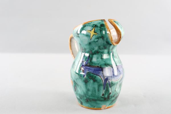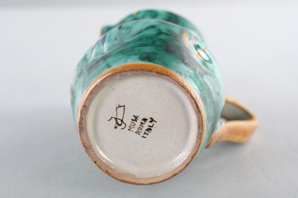 in terracotta ingobbiata e smaltata con decoro asinello . Reca sigla sotto la base .