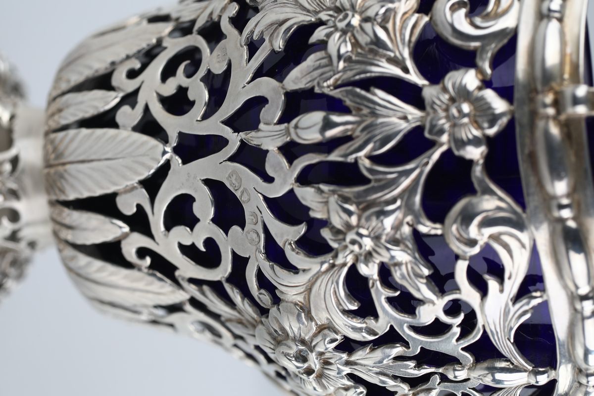 con vaschetta in vetro blu trattenuta da un fitto intreccio traforato a volute, motivi vegetali e fiori cesellati e sbalzati; piede circolare.
