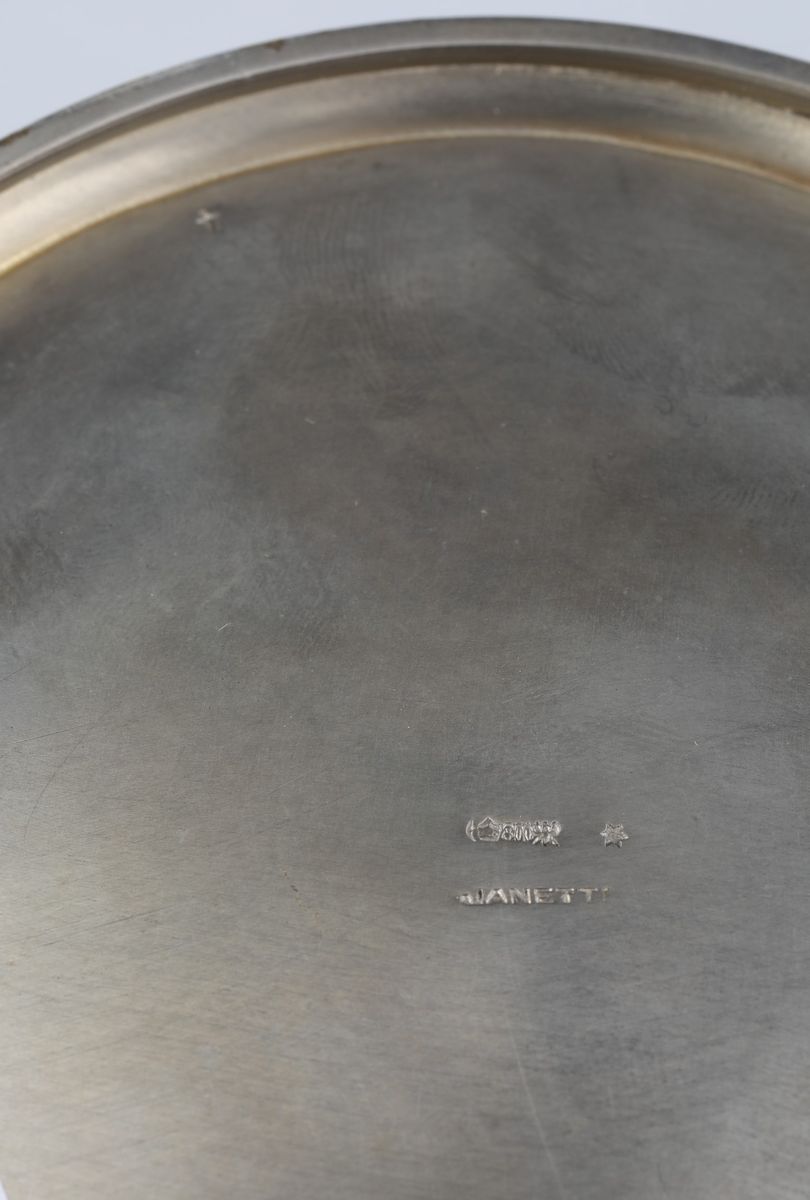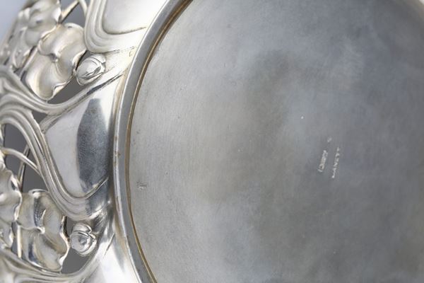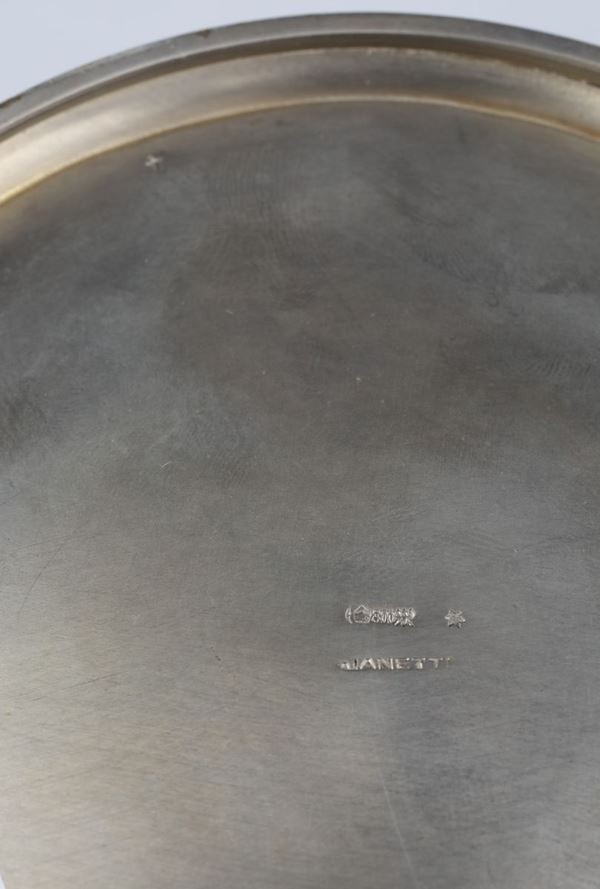 di forma circolare sagomata caratterizzata da fiori di gusto liberty racchiusi entro cartigli; interno dorato. Reca punzone dell'argentiere romano Janetti, attivo dagli anni Trenta.