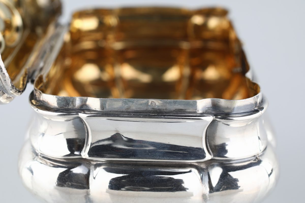 di forma rettangolare con corpo sbalzato sorretto da quattro piedi a voluta; coperchio incernierato sormontato da un fiore, apertura con pulsante a scatto, interno dorato.
