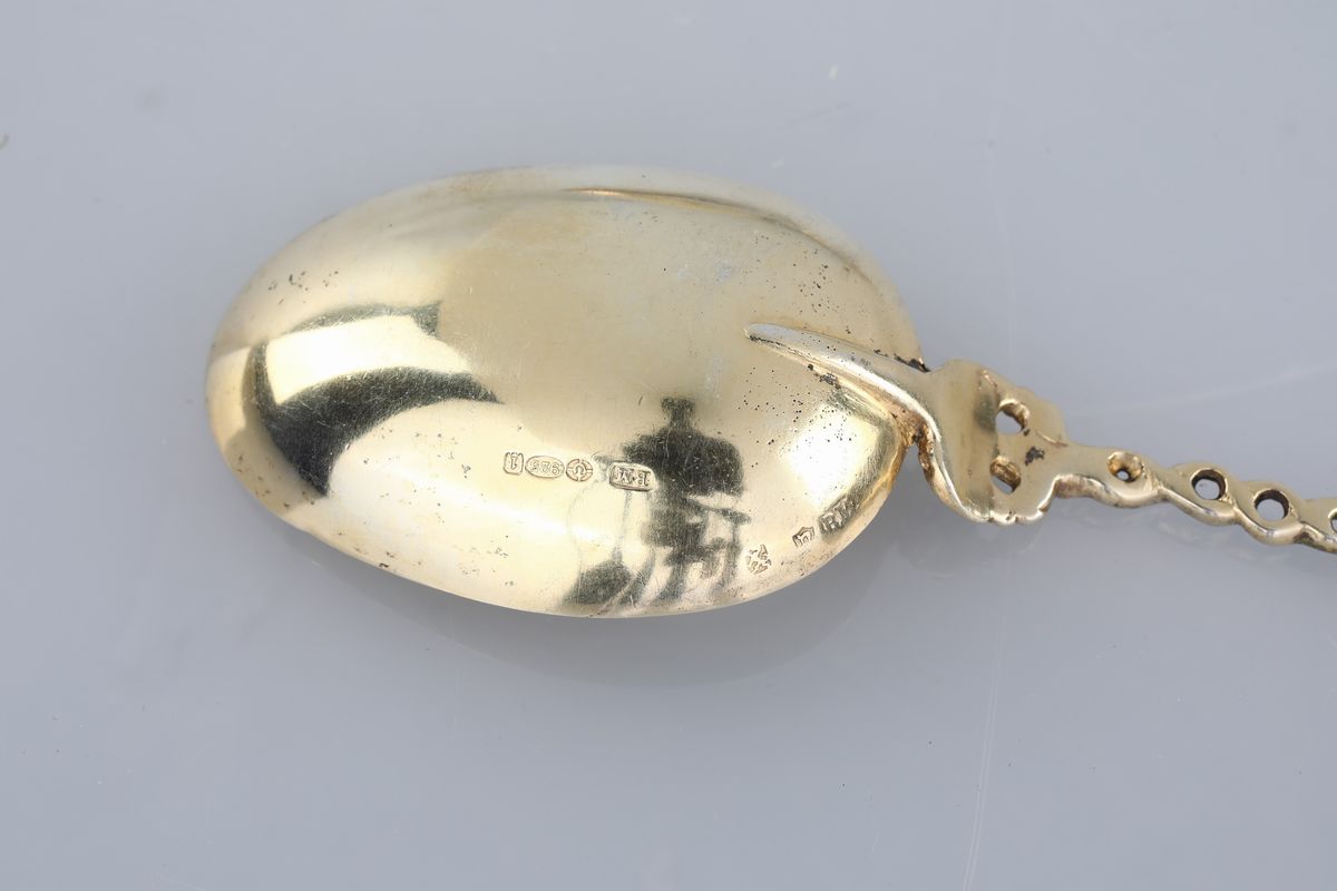 Coppia cucchiai in argento dorato 925/1000, Inghilterra/Germania, XX secolo, argentiere B.M.