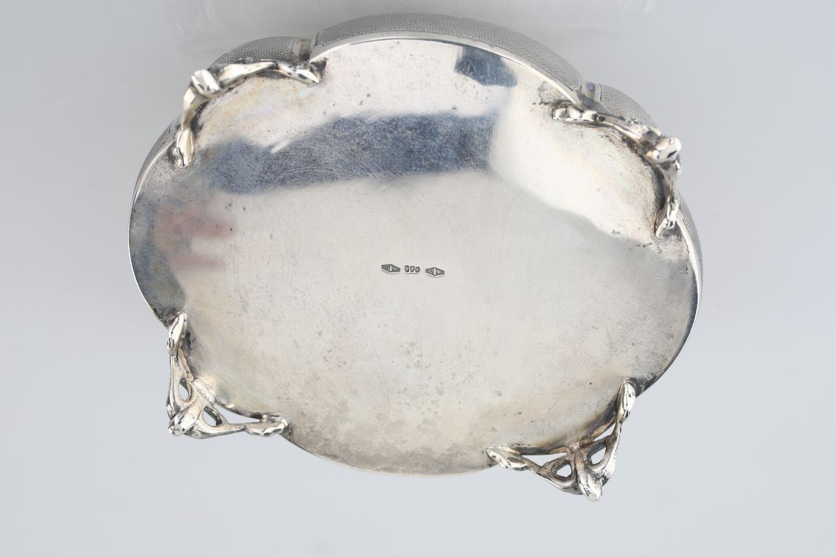 di forma ovale sagomata sottolineata da volute vegetali incise emergenti dalla superficie puntinata; coperchio incernierato dominato da una gemma cabochon di malachite, piedi a mensola. Bollo fascio.