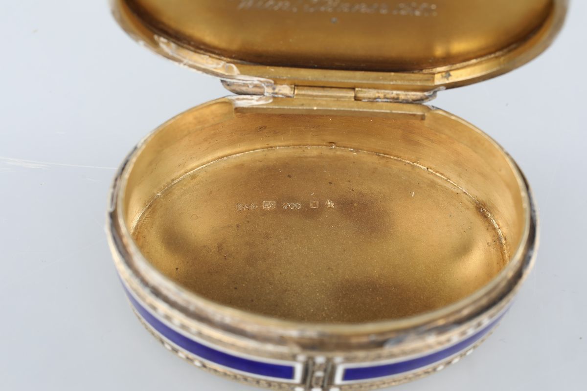 di forma ovale con interno dorato e coperchio incernierato centrato da un cesto fiorito racchiuso da perlinatura; profilo e partizioni racchiuse da piccola bordura cesellata impreziosita da filettatture e perline in smalto bianco.
