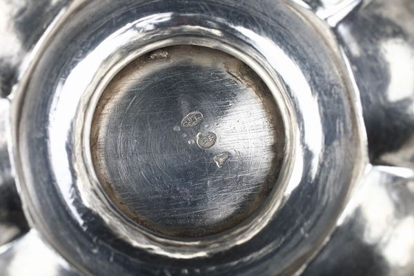 corpi baccellati decorati da stemma araldico e monogramma incisi; piede polilobato, manici sagomati con interruttori di calore in avorio.