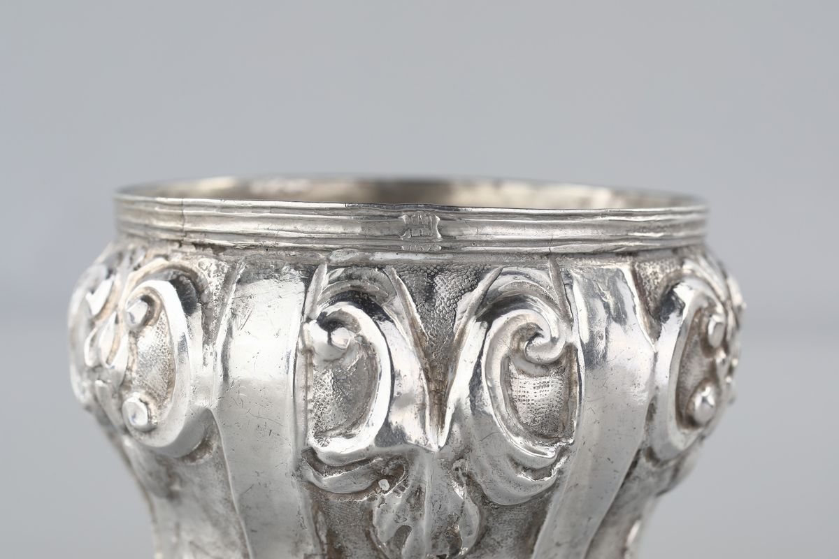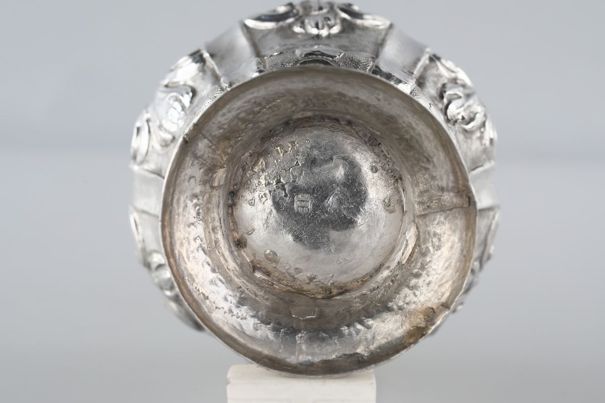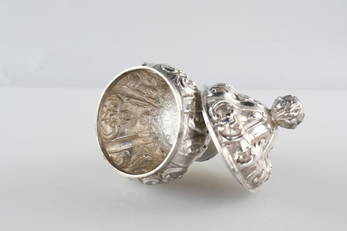 a forma di bulbo su piede circolare, con motivi vegetali sbalzati delimitati da bande lisce emergenti dal fondo puntinato. Coperchio a cupolino con analoga decorazione. Bollo torretta.