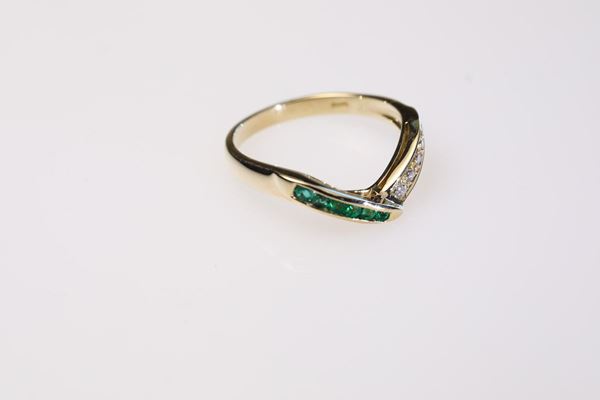 in oro giallo 750/000, smeraldi ct 0,19, brillanti ct 0,06, g 3,3, misura 15