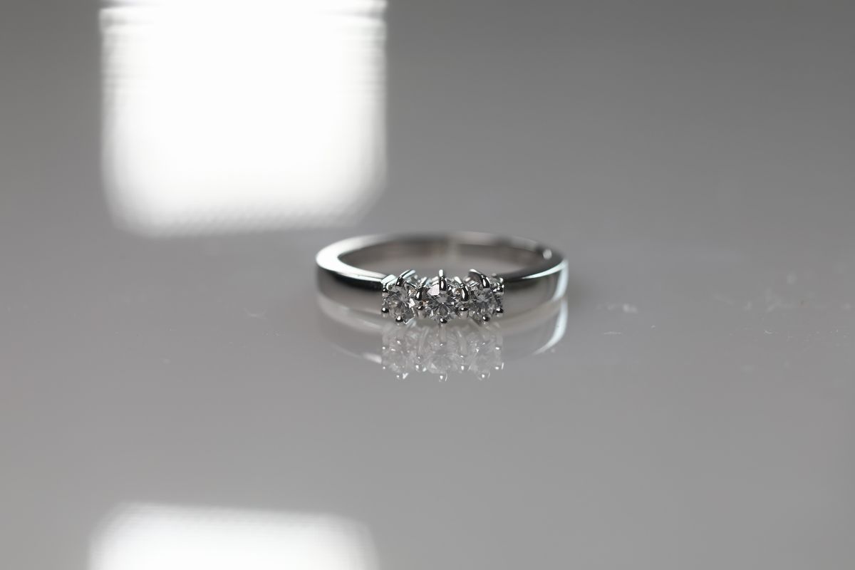 in oro bianco 750/000 con tre brillanti ct 0,33, colore G, g 3,4, misura 16