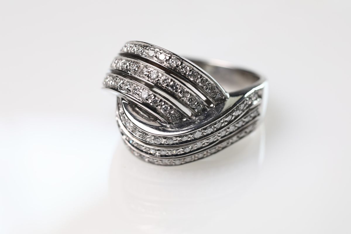 intrecciati su tre file a taglio lucido di ct 1,00, montatura in oro bianco 750/000, g 15, misura 20