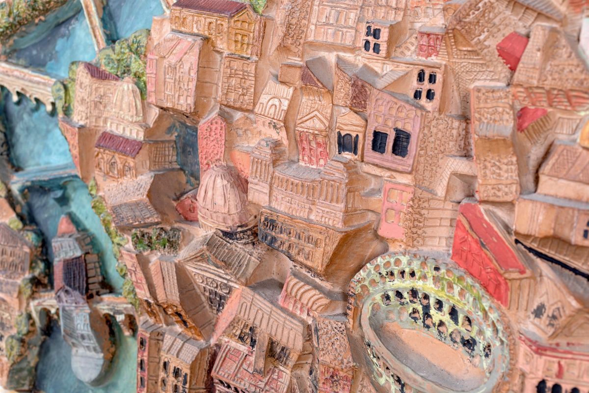 in terracotta raffigurante veduta di Roma; entro cornice in marmo