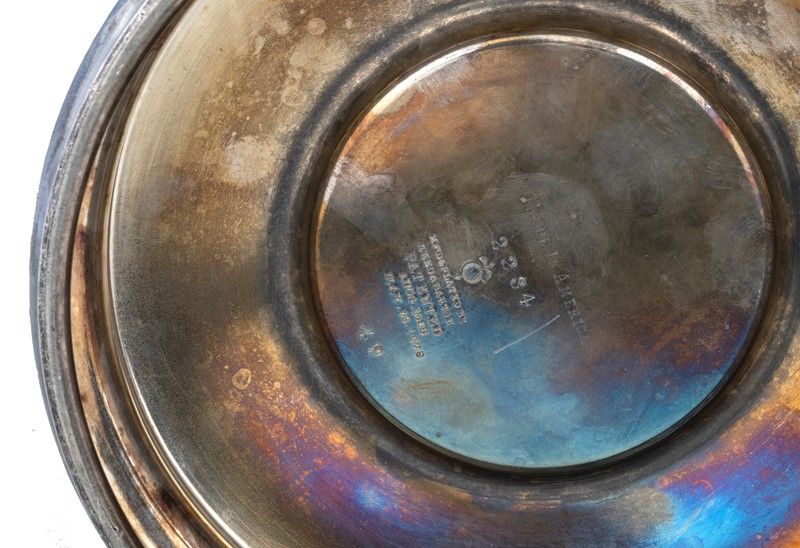 in metallo argentato, di forma cilindrica con parte interna in ceramica, decorata a sbalzo con grandi fiori. Coperchio con presa a trottola e versatoio a beccuccio. Manifattura Reed & Barton patented Aug.4.1868 May.13.1878, Made in America con numero seriale.