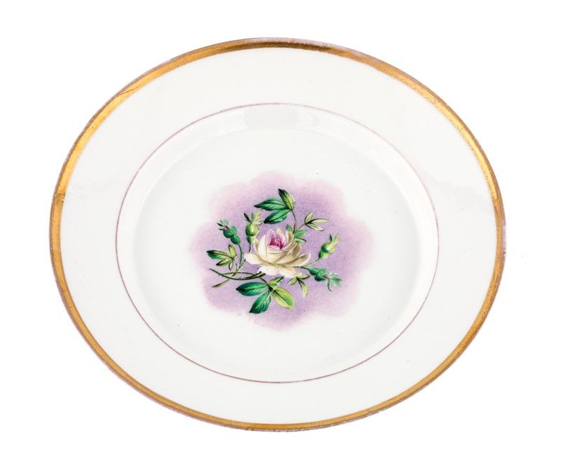 con lumeggiature dorate lungo il profilo sagomato, di cui sei decorati ognuno da diverse tipologie di fiore. Manifattura di Berlino.Una coppia centrati da rose, diametro cm 23,5