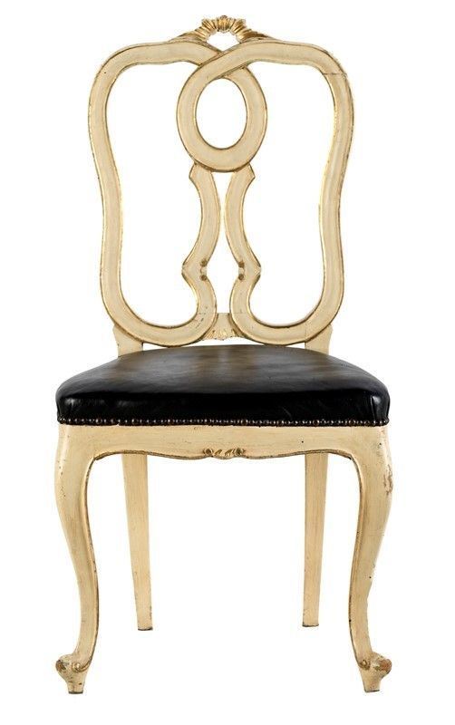 Otto sedie, di cui una danneggiata in legno laccato avorio, con cornici sagomate sottolineate da cordolo dorato; schienali a giorno, sedili imbottiti rivestiti in similpelle nera, gambe mosse.